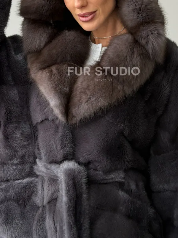 Графитовая шуба с капюшоном из куницы 102657