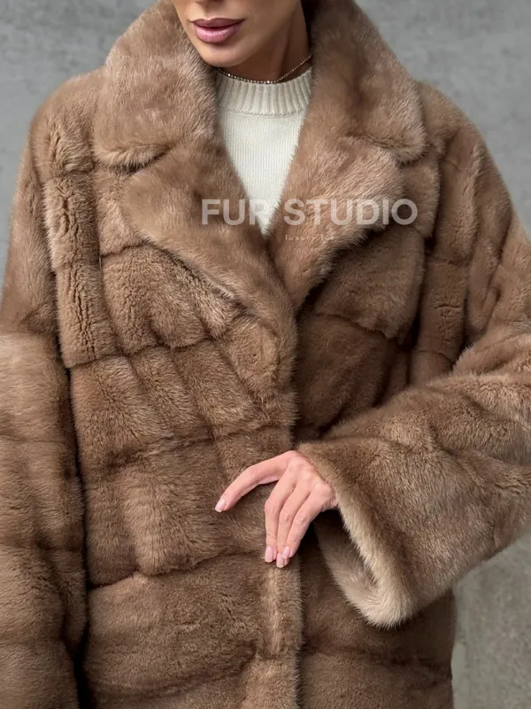 Мех данной шубы аукционная норка, цвет бежевый. Предлагается в размерах от 42 до 54. Длина модели 65-70 см , что выгодно подчеркивает фигуру девушек. Эта модель идеально подойдет для девушек и женщин, предпочитающих роскошные натуральные меха.