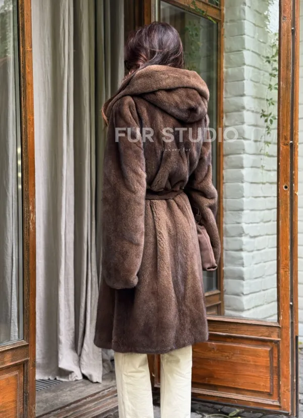 Норковая шуба с капюшоном - цвет орех 102240