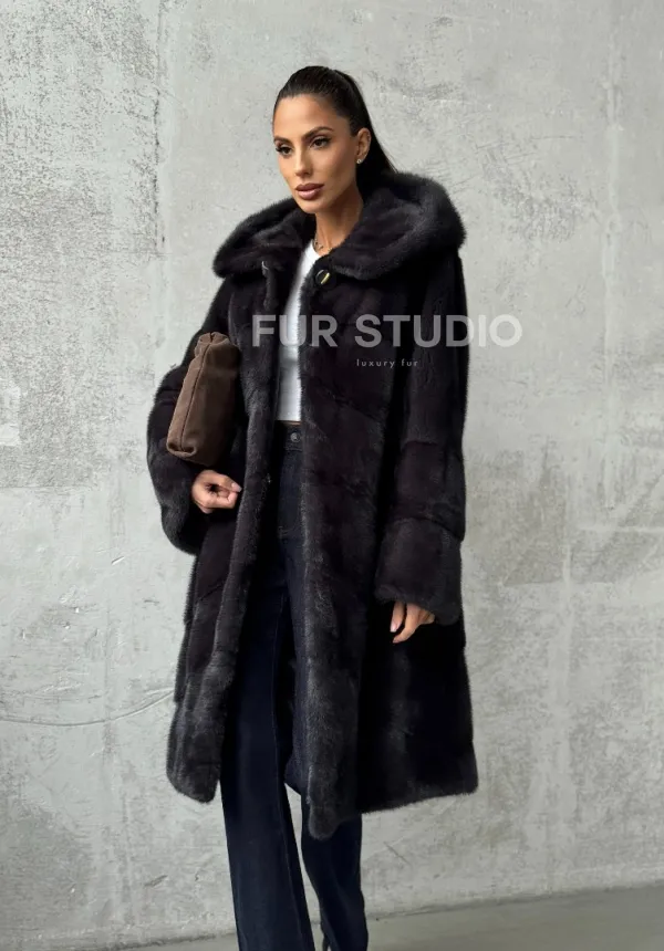Мех данной шубы аукционная норка, цвет серый. Предлагается в размерах от 42 до 60. Длина модели 95-100 см, что выгодно подчеркивает фигуру девушек. Эта модель идеально подойдет для девушек и женщин, предпочитающих роскошные натуральные меха.