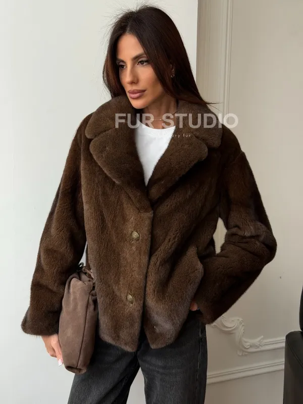 Мех данной шубы аукционная норка, цвет коричневый. Предлагается в размерах от 42 до 48. Длина модели 55-60 см, что выгодно подчеркивает фигуру девушек. Эта модель идеально подойдет для девушек и женщин, предпочитающих роскошные натуральные меха.