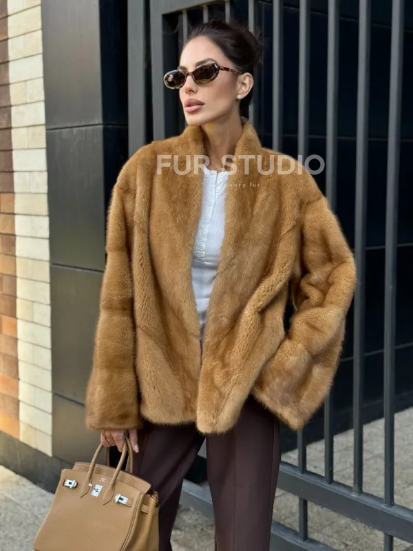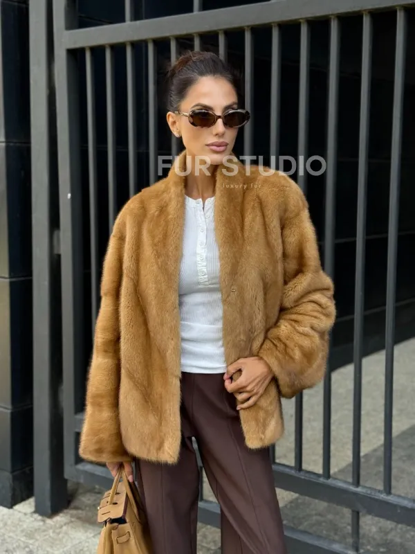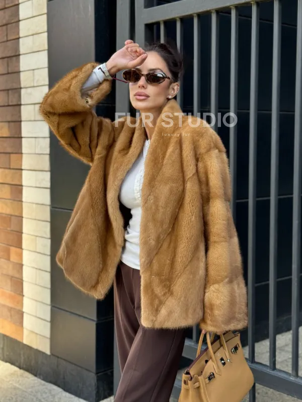 Мех данной шубы аукционная норка, цвет бежевый. Предлагается в размерах от 42 до 46. Длина модели 55-60 см, что выгодно подчеркивает фигуру девушек. Эта модель идеально подойдет для девушек и женщин, предпочитающих роскошные натуральные меха.
