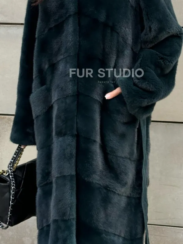 Мех данной шубы аукционная норка , цвет зеленый. Предлагается в размерах от 42 до 50. Длина модели 110-115 см, что выгодно подчеркивает фигуру девушек. Эта модель идеально подойдет для девушек и женщин, предпочитающих роскошные натуральные меха.