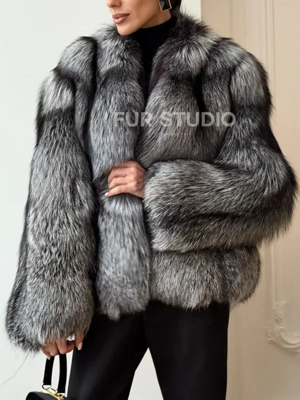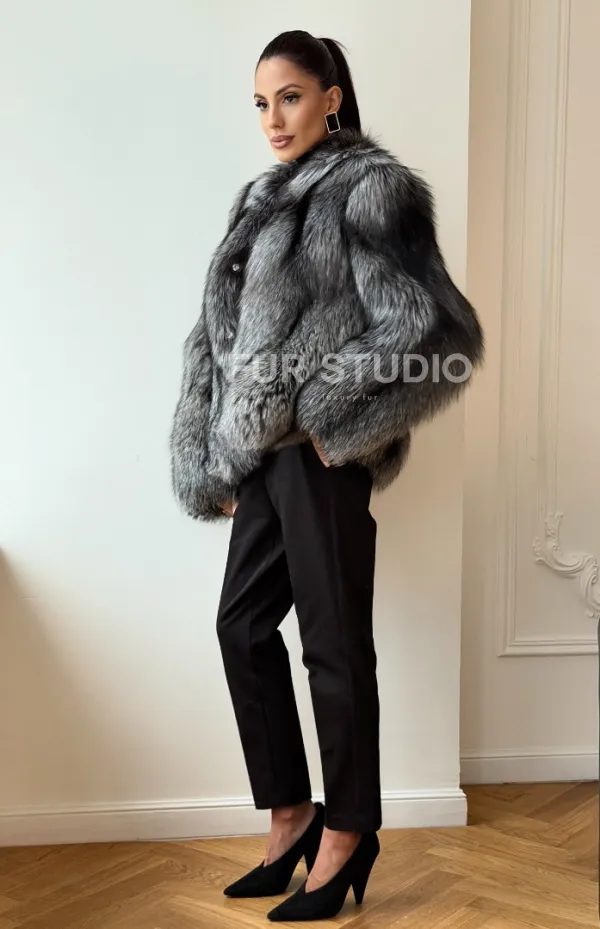 Мех данной шубы лиса, цвет серый. Предлагается в размерах от 42 до 50. Длина модели 60-65 см, что выгодно подчеркивает фигуру девушек. Эта модель идеально подойдет для девушек и женщин, предпочитающих роскошные натуральные меха.
