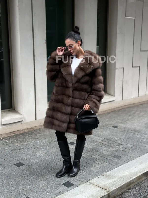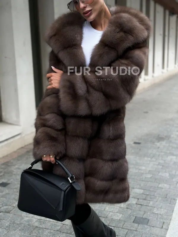 Шуба из меха куницы с капюшоном цвет трюфель 100997