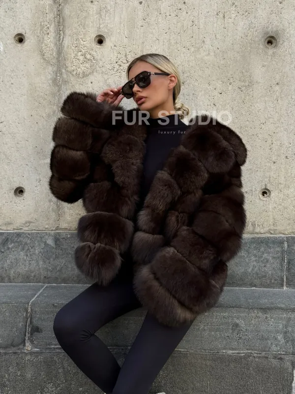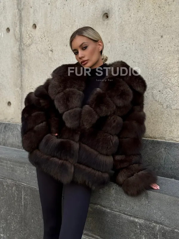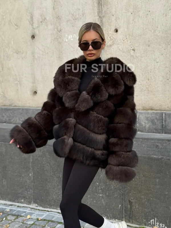 Мех данной шубы финский песец, цвет коричневый. Предлагается в размерах от 42 до 48. Длина модели 60-65 см, что выгодно подчеркивает фигуру девушек. Эта модель идеально подойдет для девушек и женщин, предпочитающих роскошные натуральные меха.